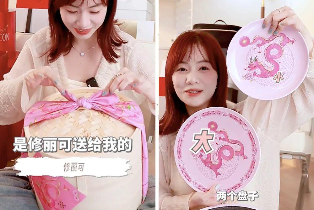 一大一小很漂亮的喜行乐龙年餐盘,这个手工坊挑升作念陶瓷的,绝顶精细,所有这个词是粉色,又潮又有中国风。