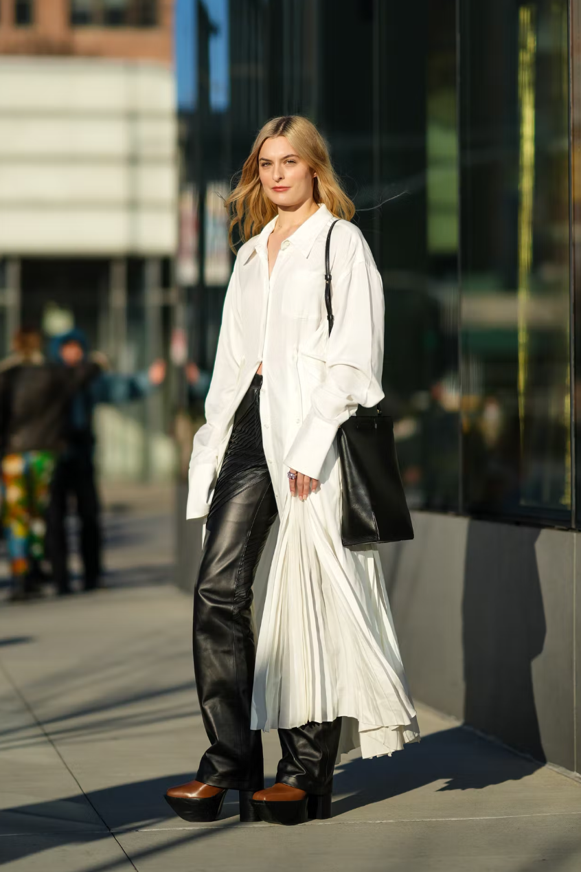 关于高个子青娥来说,长款衬衫裙是一个大约展现身体上风的绝佳采用。解开衬衫裙的扣子,露出内搭的裤装,不仅大约营造出一种前卫脉络感,还能在视觉上拉长腿部比例,使身体显得愈加修长。为了进一步强化这种恶果,漠视搭配一个雅致的腰包。