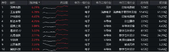 聚焦电子50指数涨幅前10大成份股,深南电路、工业富联飙涨逾6%,此外,半导体行业(申万二级行业口径)个股发达亮眼!斯达半导、寒武纪-U、兆易创新、澜起科技等个股涨幅居前。