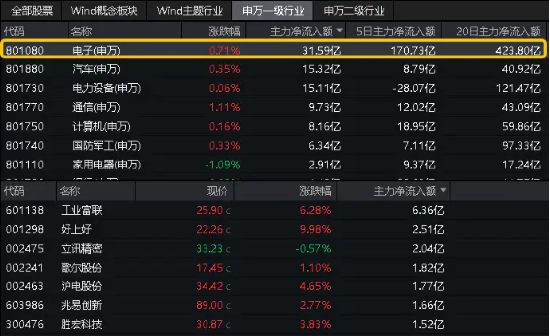 资金面上,电子板块弥远受主力资金扎眼,当天全天吸金31.59亿元,近5日吸金170.73亿元,近20日吸金423.8亿元,抓续霸居31个申万一级行业榜首!其中,工业富联获主力资金加仓6.36亿元,踏进A股吸金榜第二位!
